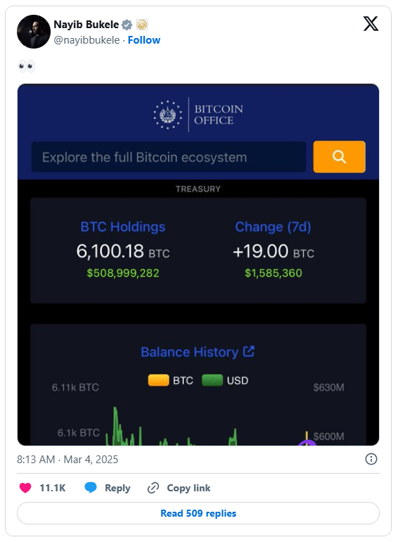 El Salvador’s President Nayib Bukele purchased 19 BTC on Monday, despite the IMF’s new $1.4 billion aid package restricting public Bitcoin accumulation. The IMF deal mandates that El Salvador halt voluntary BTC purchases, citing volatility and low trust as barriers to adoption. The country holds over 6,081 BTC, worth $600 million, managed by its Bitcoin agency.