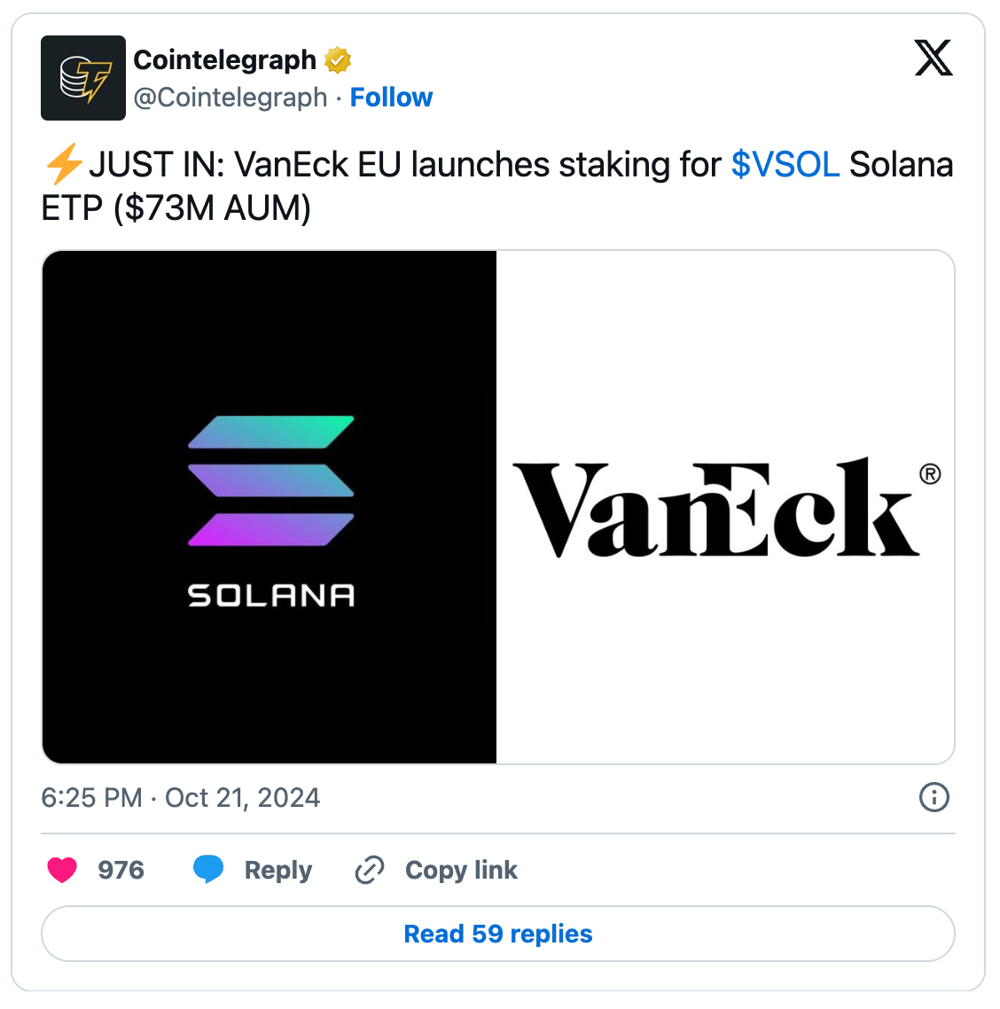 VanEck will charge a 25% fee on the staking rewards, similar to its Ethereum ETN. Staking rewards for US-based crypto ETFs remain unapproved by the SEC, as shown by VanEck’s decision to exclude staking from its US-based Solana ETF. Solana is the third-largest blockchain in terms of inflows this year, following Bitcoin and Ethereum, attracting $58 million in investment.