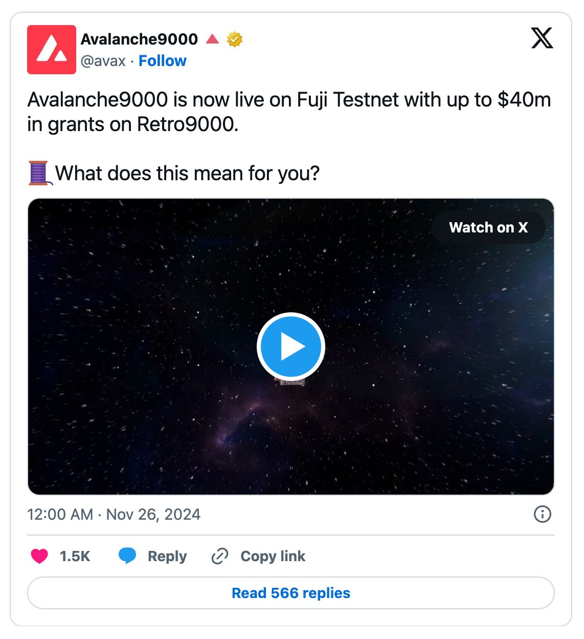 Avalanche has launched the "Avalanche9000" upgrade on its Fuji testnet, accompanied by $40 million in retroactive grants for developers. The upgrade aims to reduce development costs on its mainnet, the C-Chain, and includes changes like cutting validator fees by 96%.