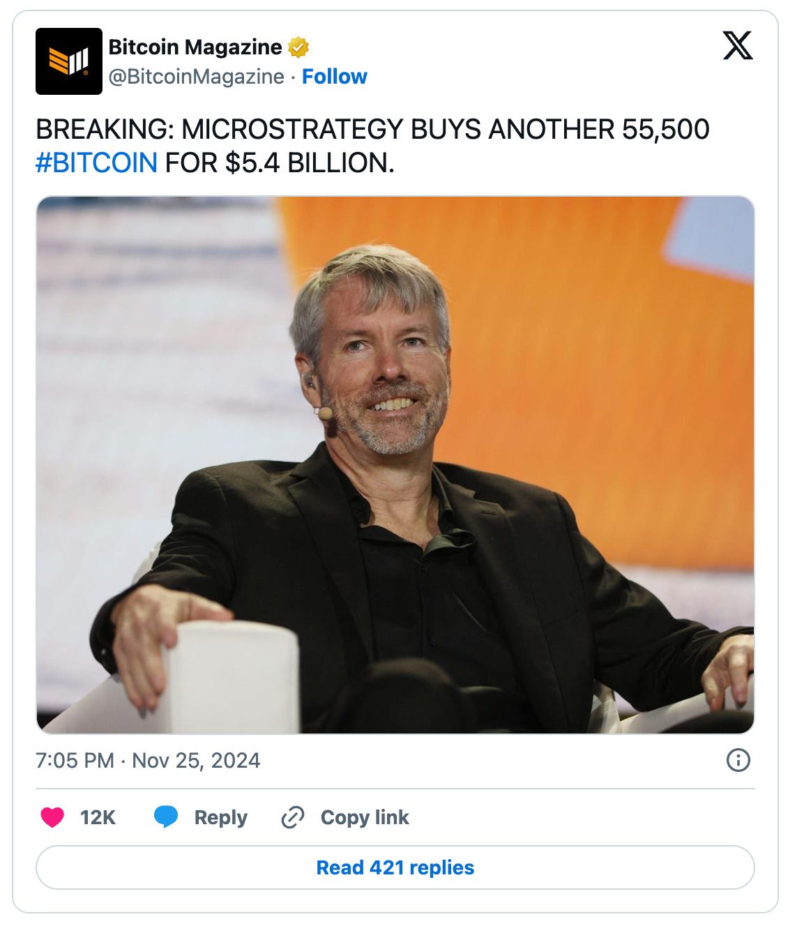 MicroStrategy Acquires Record 55,500 Bitcoin Worth $5.4 Billion