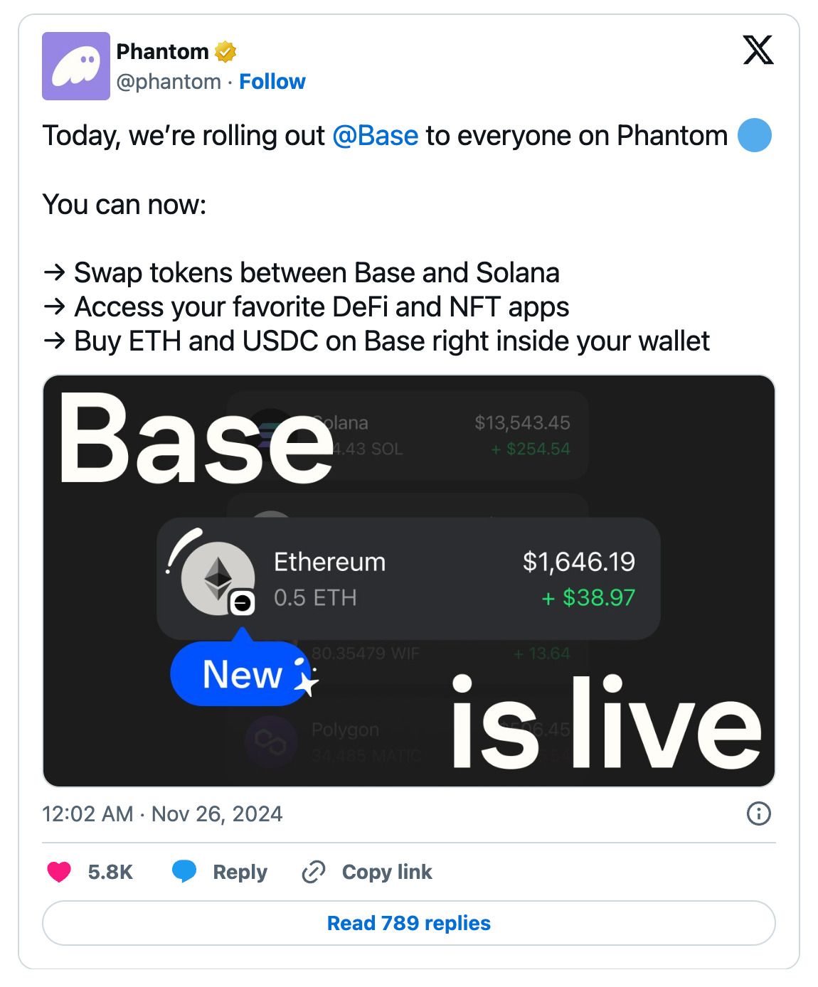 Phantom wallet has rolled out support for Base, Coinbase's Ethereum-based Layer 2 blockchain, extending its multi-chain offerings. This integration allows users to swap tokens and buy Ether and USDC on Base. Phantom initially focused on Solana but expanded in 2023 to support Ethereum, Polygon, and now Base, with a vision for cross-chain interoperability.
