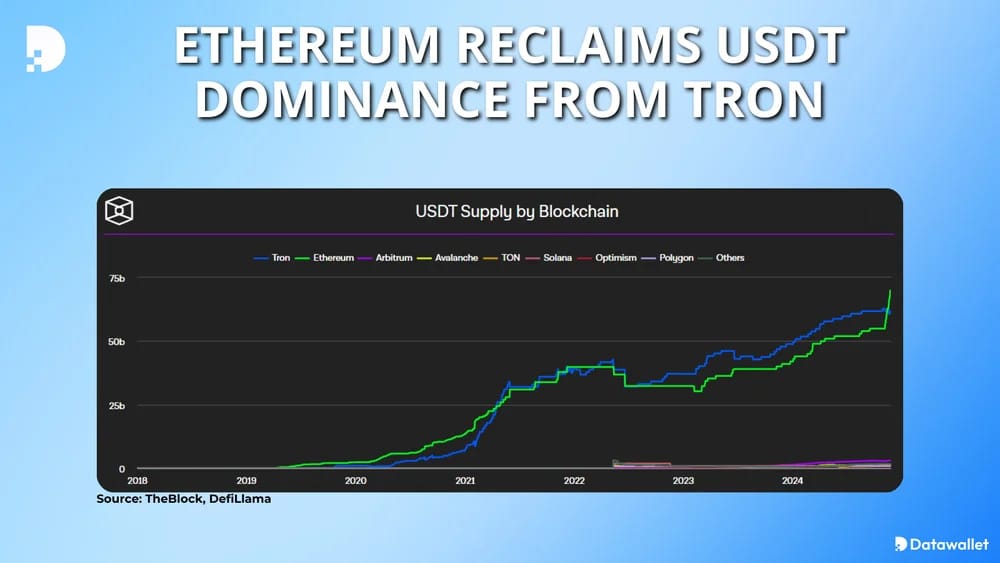 Ethereum has overtaken Tron in terms of USDT stablecoin supply for the first time since June 2022, with 66.936 billion USDT now hosted on its blockchain.