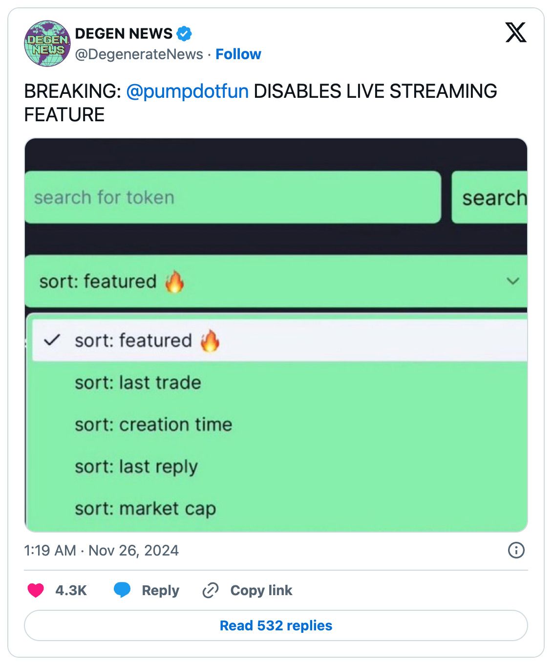 Pump.fun Disables Livestreaming Feature After User Backlash