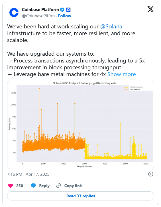 The SOL price is now up over 23% this week, outperforming major coins including Bitcoin and Ethereum. Coinbase said the new backend uses bare-metal machines and asynchronous processing to increase efficiency by up to 5x. The double catalyst of ETF exposure and better trading performance has reinvigorated investor interest in the asset.