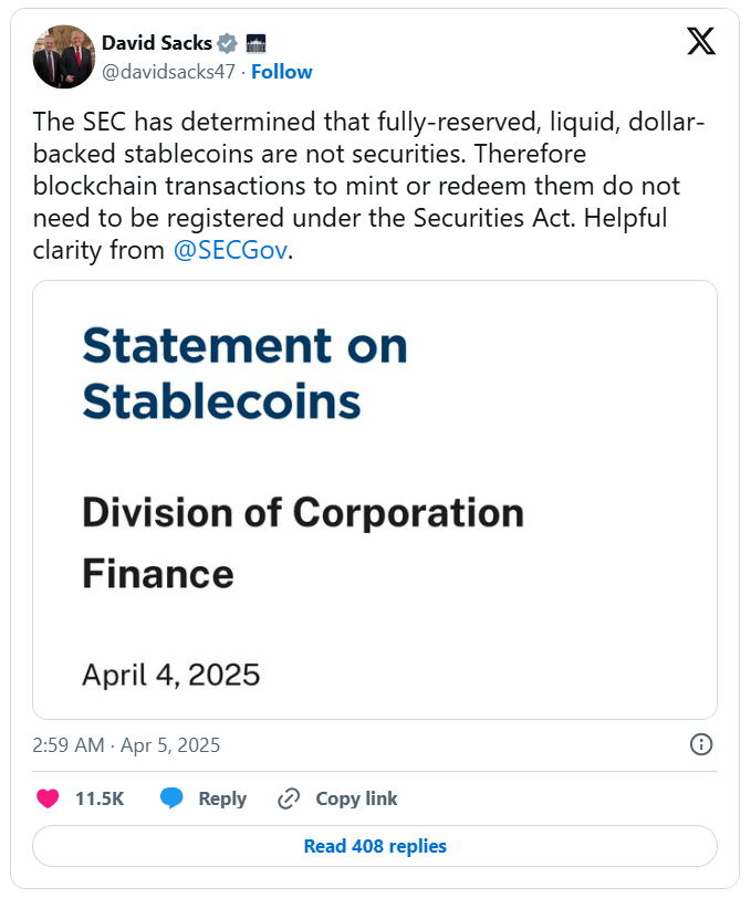 The U.S. Securities and Exchange Commission announced that stablecoins pegged 1:1 to the U.S. dollar and backed by liquid, low-risk reserves will not be classified as securities. The guidance applies only to stablecoins redeemable for dollars and explicitly excludes yield-bearing or algorithmic stablecoins from the exemption.