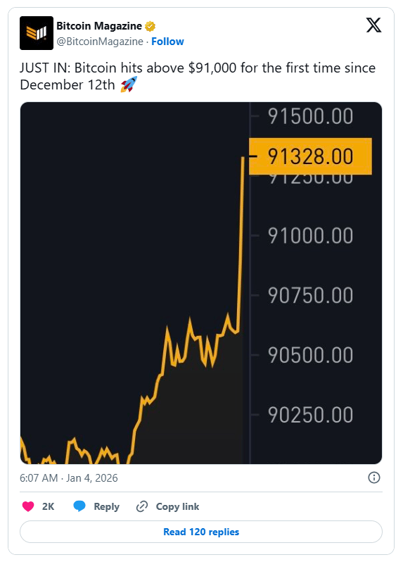 GM. Bitcoin ripped past $91,000 as Trump’s removal of Venezuela’s Nicolás Maduro jolted markets and triggered more than $130 million in short liquidations during crypto’s fiery New Year rebound.