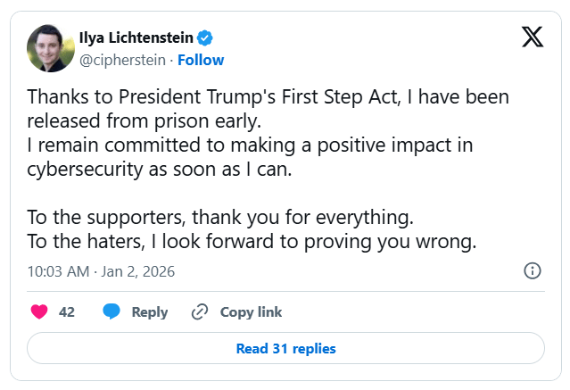 Bitfinex hacker Ilya Lichtenstein announced early release from prison citing reforms under Trump’s First Step Act. Lichtenstein was sentenced in 2024 for laundering bitcoin stolen during the $4 billion exchange breach incident. He credited rehabilitation provisions and cooperation with authorities recovering assets in the largest US crypto seizure.