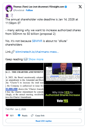 Lee said that if ether prices go up, BitMine shares could go above $500 without any changes to the company's structure, making it one of the leading crypto stocks. BitMine holds roughly 3.41% of circulating ETH, totaling more than 4.1 million ether after recent purchases. Shareholders must vote by January 14 to determine approval of the proposed capital structure changes ahead.