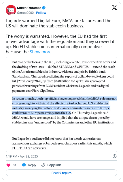 The European Commission rejected the ECB's warning, arguing current rules are sufficient to manage stablecoin risks. Critics say MiCA’s strict reserve requirements have already made Euro stablecoins uncompetitive globally. USDT, the world’s largest stablecoin, has been delisted by several major EU exchanges due to ongoing compliance issues under MiCA rules.