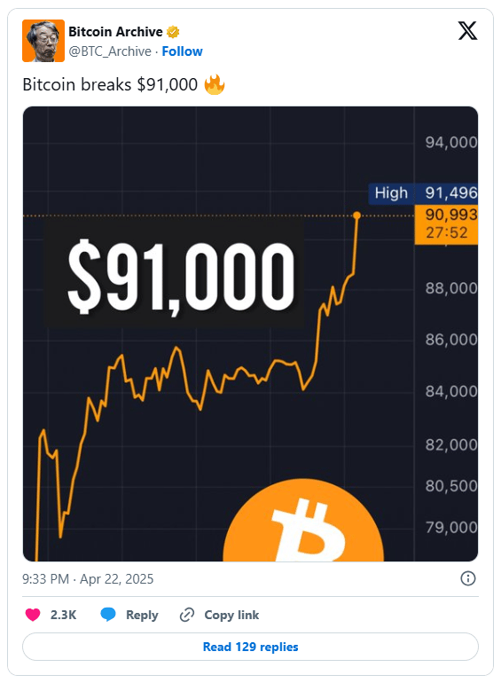 Bitcoin Soars Past $91,000 For The First Time in Seven Weeks