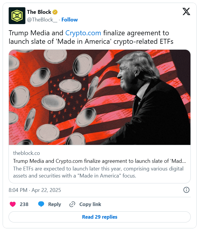 The products are expected to launch later in 2025 pending regulatory approval and will be distributed through Crypto.com’s broker-dealer Foris Capital US. TruthFi has also partnered with Charles Schwab to manage separately managed accounts (SMAs) alongside the ETF lineup. Trump Media’s board has already approved a $250 million capital allocation to support these offerings across platforms in the USA, Europe, and Asia.