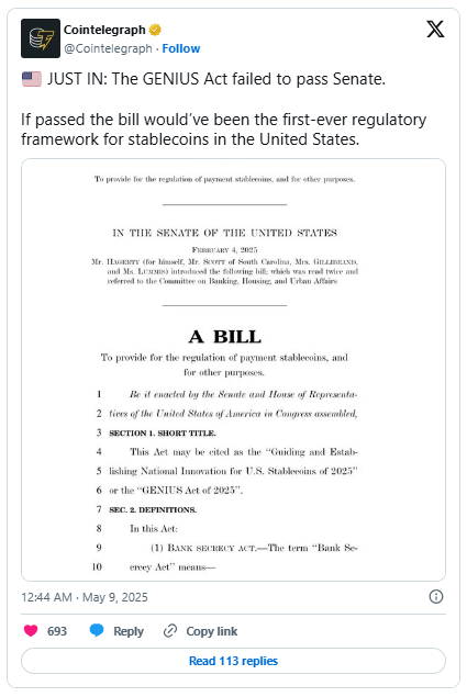 Senate’s GENIUS Act Fails Stalling Stablecoin Legislation
