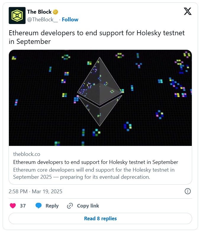 Ethereum Devs to Shut Down Holesky Testnet in September