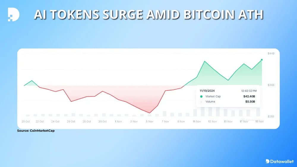 The market capitalization of AI and big data tokens has skyrocketed by 131.4% since June, reaching $42.1 billion on November 19. Tokens like Near Protocol, Internet Computer, and Render lead the sector’s growth, buoyed by Bitcoin’s rally and improving investor sentiment.
