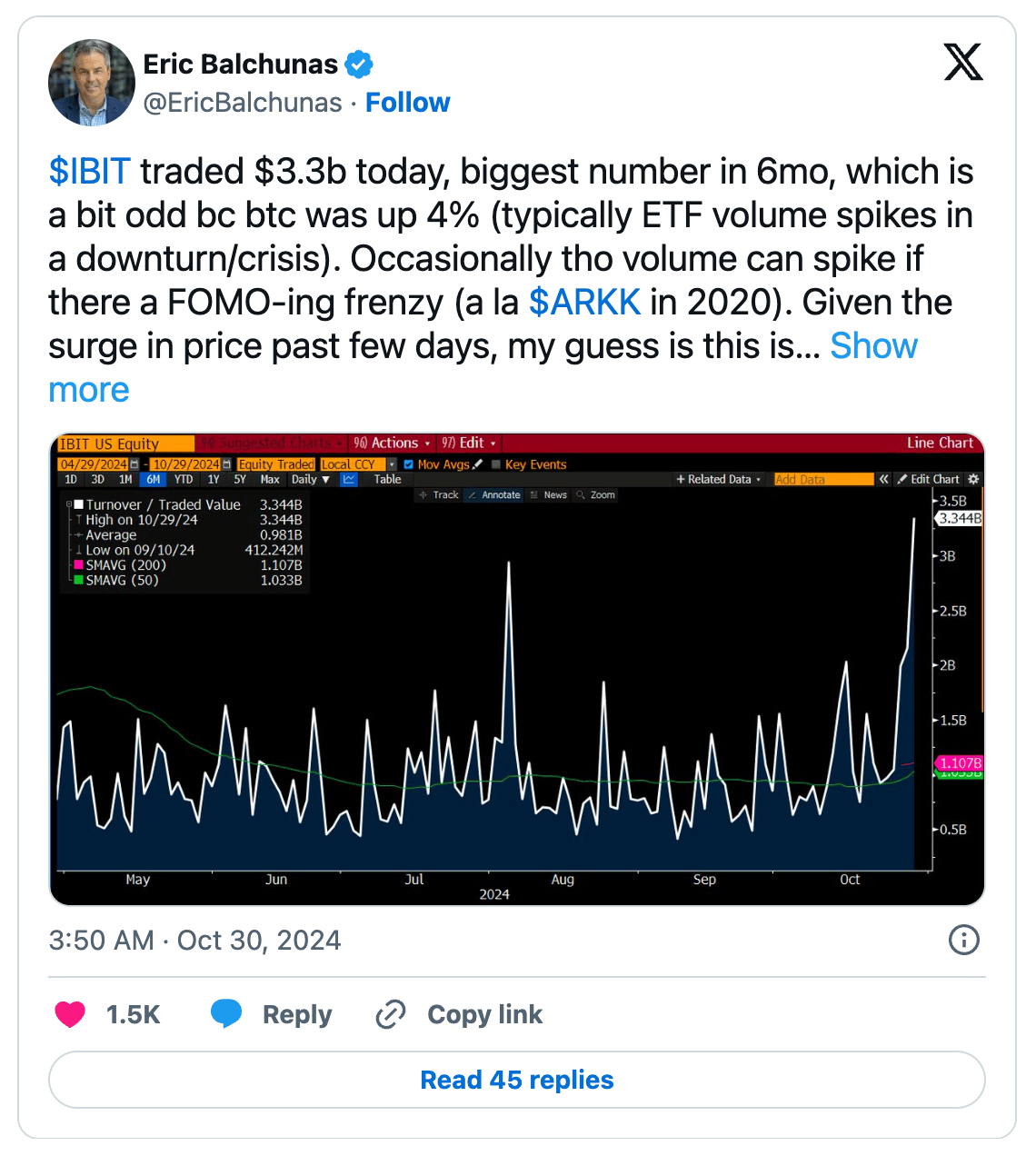 On October 29, BlackRock’s Bitcoin ETF reached $3.35 billion in daily trading volume, its highest in over six months. Bloomberg analyst Eric Balchunas attributed this spike to “FOMO” buying as Bitcoin approached an all-time high of $72,390. Across all US spot Bitcoin ETFs, total inflows hit $827 million, with BlackRock’s IBIT leading at $599.8 million.