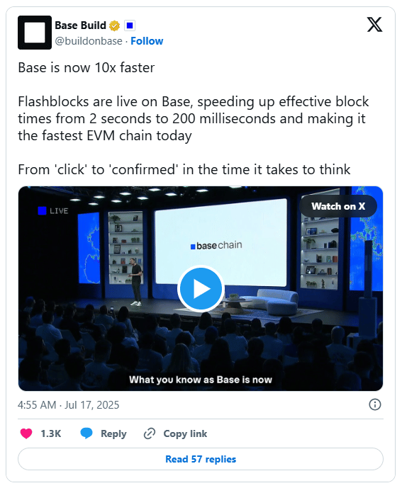 Coinbase’s Layer 2 network Base activated Flashblocks on July 17, reducing block times from two seconds to just 200 milliseconds. The upgrade, built with Flashbots, delivers streamed sub-blocks every 0.2 seconds, allowing near-instant confirmation. Flashblocks was tested in February on the Sepolia testnet and now debuts on Base mainnet with support for high-frequency apps.
