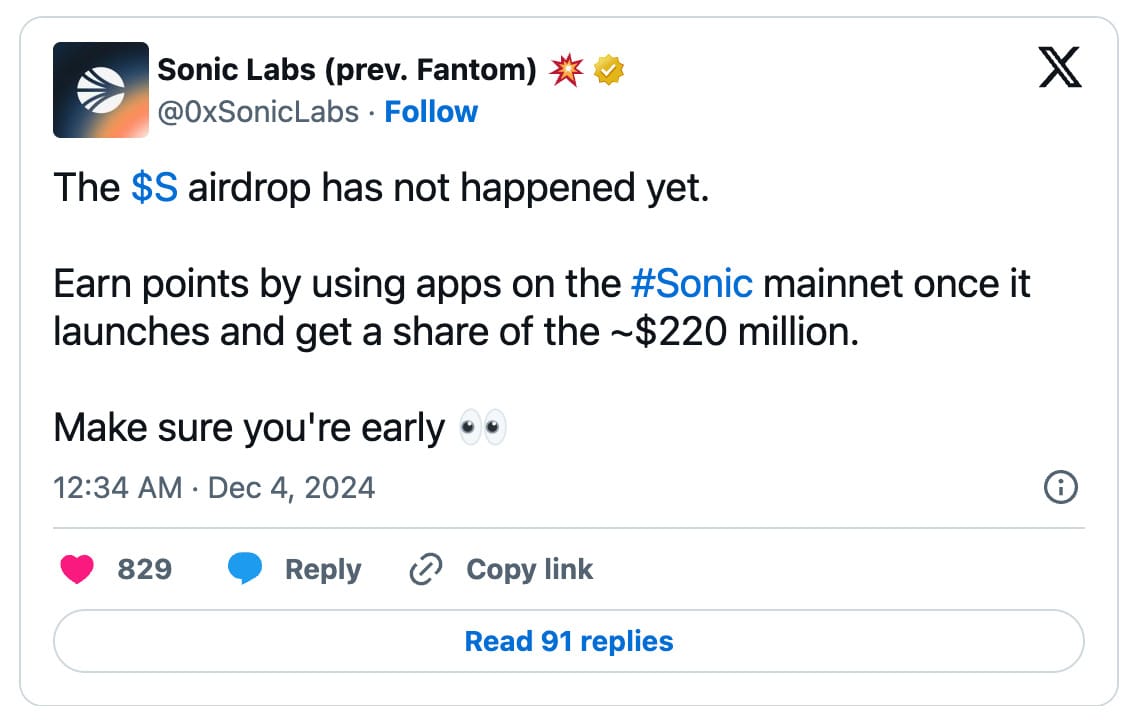 Sonic will run on a proof-of-stake mechanism, allowing S holders to stake their tokens for rewards. The platform is designed to achieve transaction finality within 720 milliseconds, potentially competing with other high-speed EVM chains. Sonic’s upcoming airdrop will distribute 200 million S tokens for which users can still earn eligibility by using the upcoming dApps on the mainnet.