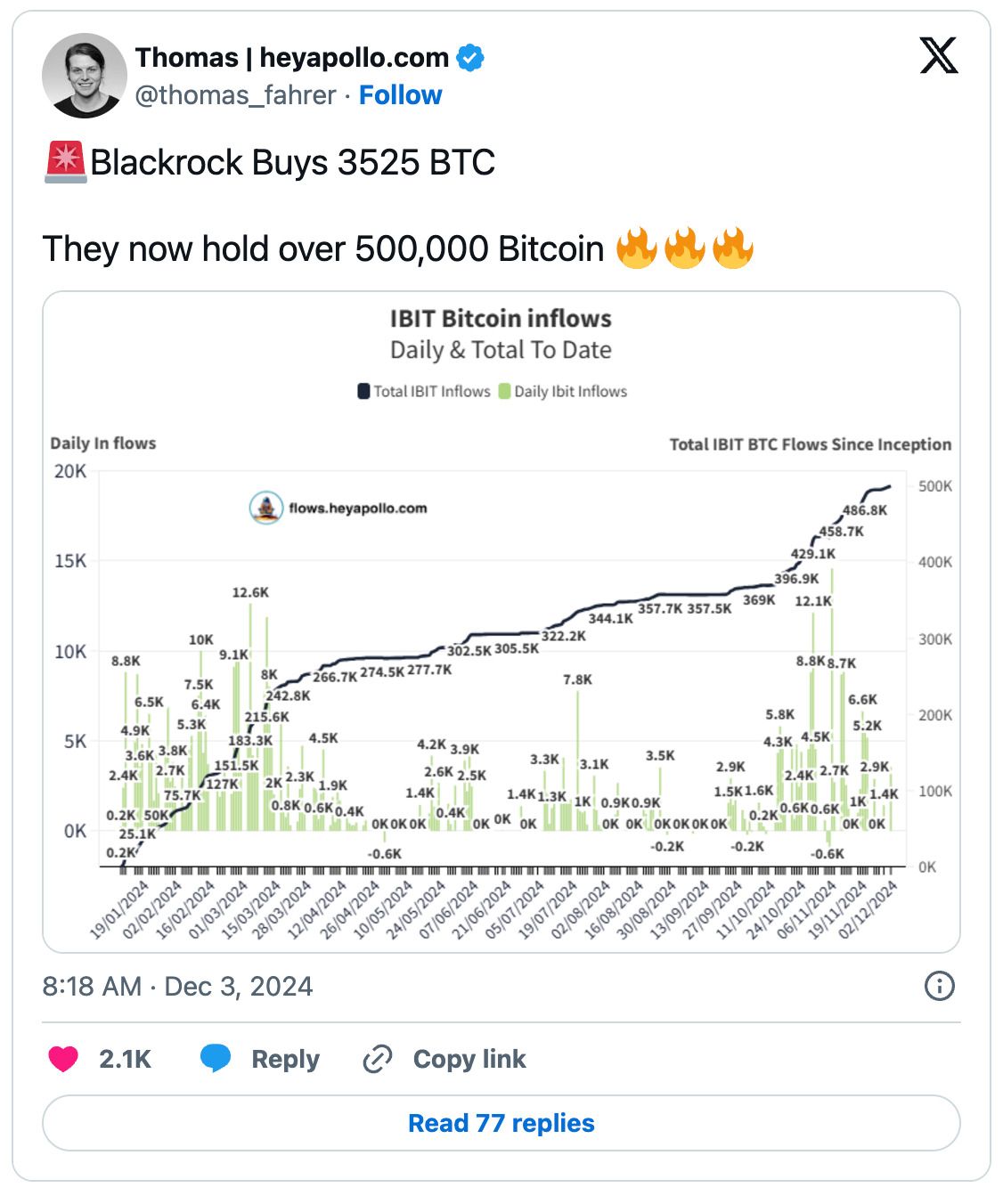 Meanwhile, BTC seems stuck consolidating around $95,000, but that hasn’t deterred BlackRock. The asset management giant has kept on its buying spree and now owns 500,000 Bitcoin.