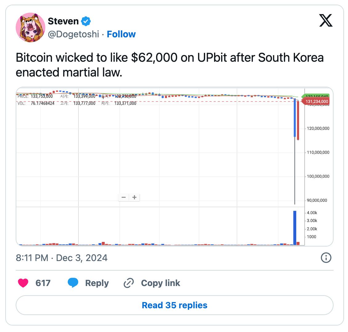 Bitcoin’s price tumbled to $61,600 on South Korea's Upbit exchange following the president’s declaration of martial law. The announcement led to a sharp 33% drop in Bitcoin's value on Upbit before a partial recovery to around $88,600. This created an 8% discount compared to Bitcoin’s international price of $95,900.