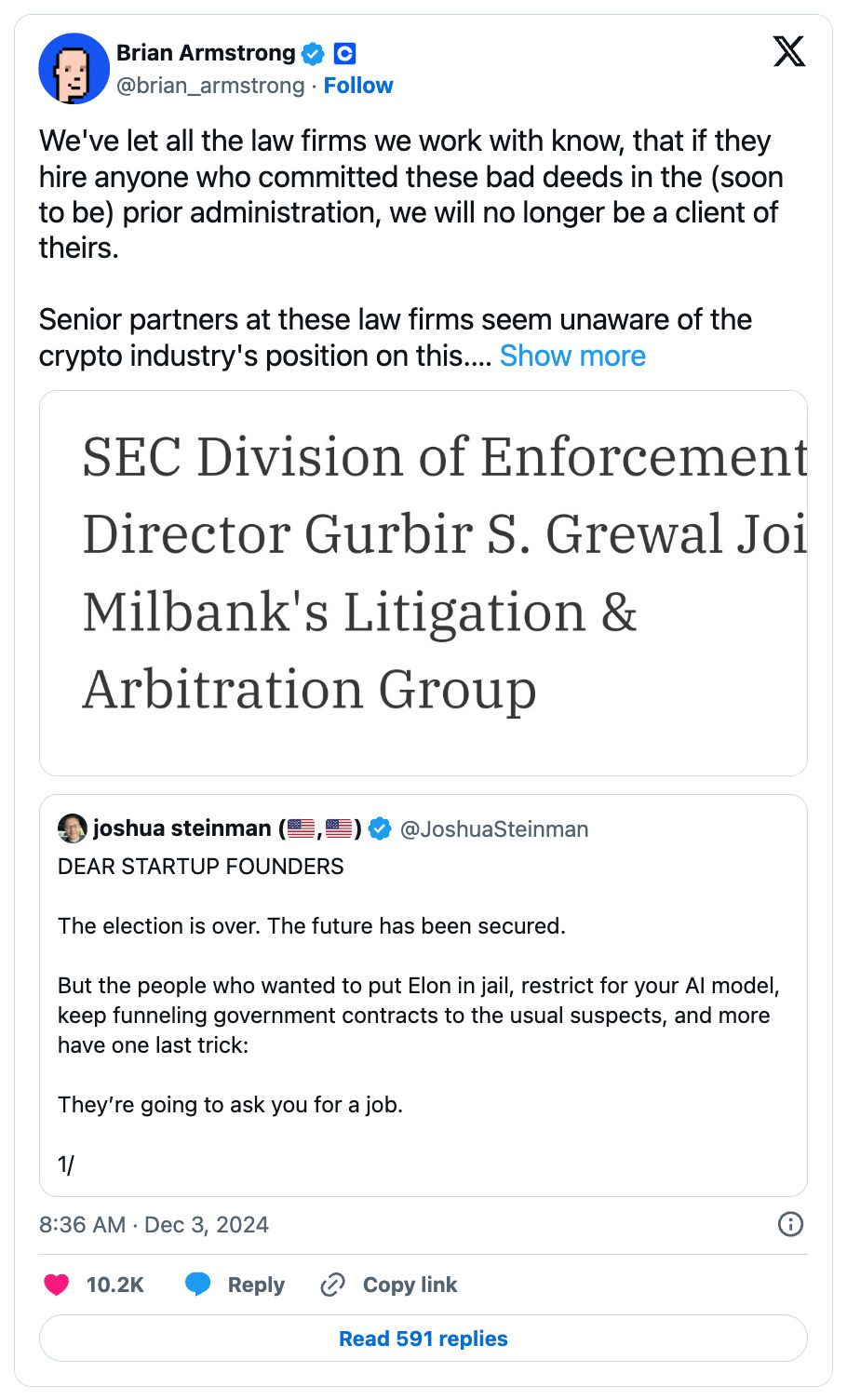 Coinbase CEO Brian Armstrong announced that the company will no longer work with law firms employing ex-SEC officials involved in anti-crypto actions. The announcement specifically targeted Milbank, which recently hired former SEC Enforcement Division head Gurbir Grewal, a figure linked to lawsuits against Coinbase and other crypto companies.