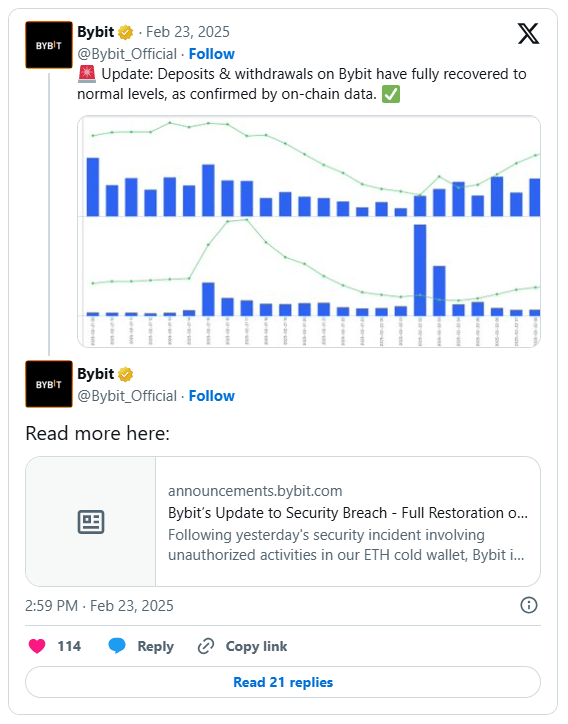With a $20 billion asset base, Bybit has committed to strengthening security infrastructure and reinforcing liquidity to prevent future breaches. Zhou also commented, “This was truly a tragic event for Bybit, but the industry showed strength, united together. I have faith that it’s only up from now.”