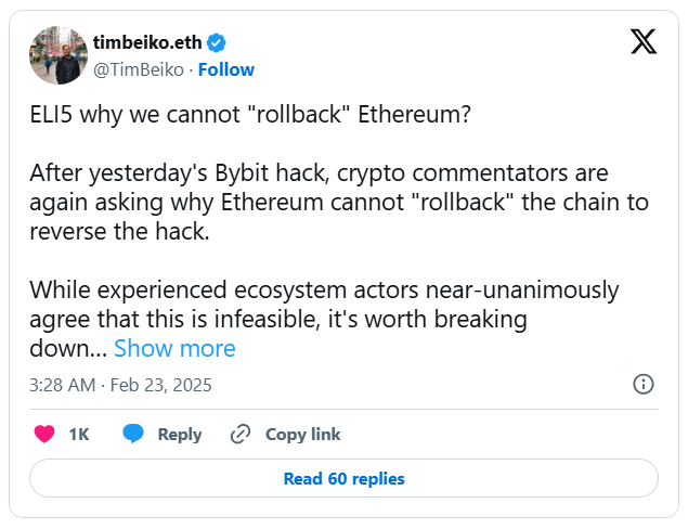 Following the $1.5 billion Bybit hack, some industry figures, including BitMEX co-founder Arthur Hayes, called for an Ethereum rollback to recover stolen funds. However, Ethereum core developer Tim Beiko dismissed the idea, stating, “This reasonably sounding proposal is technically intractable for less knowledgeable observers.”