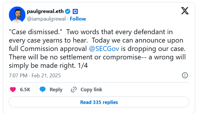 SEC has agreed in principle to dismiss its lawsuit against Coinbase. The case, which accused Coinbase of operating as an unregistered broker and exchange, has cost the company millions in legal fees since it was filed in June 2023. “There will be no settlement or compromise—a wrong will simply be made right,” said Coinbase Chief Legal Officer Paul Grewal.