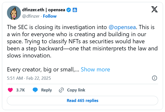 The SEC has officially dropped its investigation into OpenSea, months after issuing the NFT marketplace a Wells Notice over alleged unregistered securities violations. This and the Coinbase story signal a regulatory shift under Acting Chairman Mark T. Uyeda. “SEC confirmed that it doesn’t recommend an enforcement action against OpenSea,” the company stated.