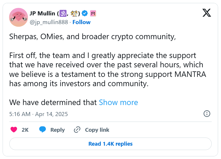 Mantra CEO John Mullin addressed the community following OM’s sharp price crash, saying the recovery of the token is the project’s “primary concern.” During an AMA on April 14, he said early plans for a potential token buyback or burn are being considered, but nothing is finalized. OM briefly fell to $0.52 before bouncing back slightly to $0.73 at time of writing.