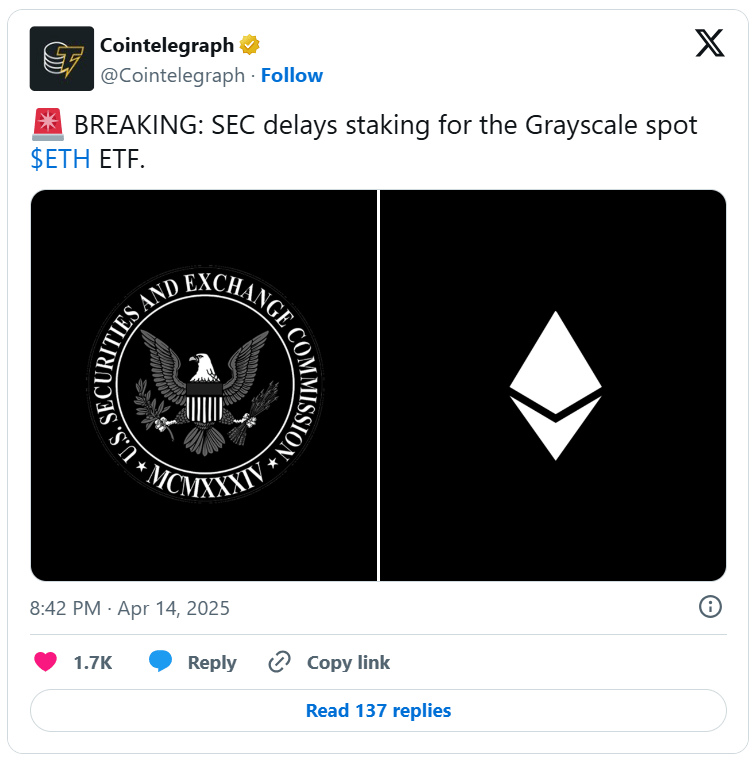 The SEC has delayed its decision on whether to allow Ether staking in Grayscale’s Ethereum Trust and Mini Trust ETFs. The new deadline is set for June 1, though the final determination must come by the end of October. Grayscale and others, including BlackRock, are seeking to add staking rewards to boost yield for ETF investors.