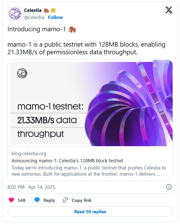 - Celestia Launches 128MB Block Testnet "mamo-1"