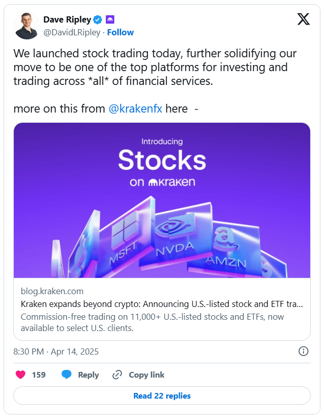 The exchange’s expansion follows a favorable shift in regulatory tone, including the SEC’s recent dismissal of its enforcement case. Kraken also acquired futures platform NinjaTrader for $1.5 billion and confirmed plans to go public, though no timeline was given. Global expansion of equities trading is underway, with future access planned for UK, EU, and Australia users.