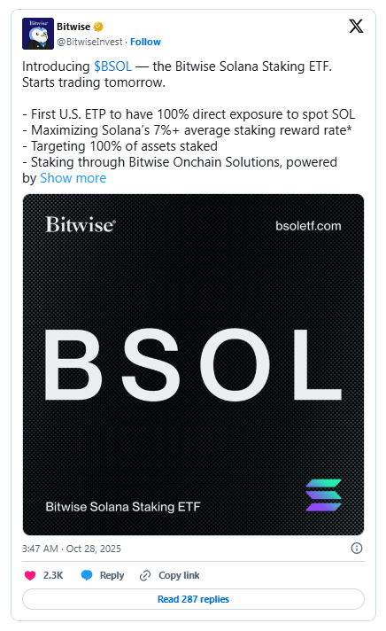 Bitwise Asset Management will launch its Solana Staking ETF, ticker BSOL, on the New York Stock Exchange Tuesday. The firm said it is the first US exchange-traded product offering one hundred percent spot exposure to Solana. CEO Hunter Horsley noted the listing represents a new milestone for digital assets entering mainstream institutional investment channels.