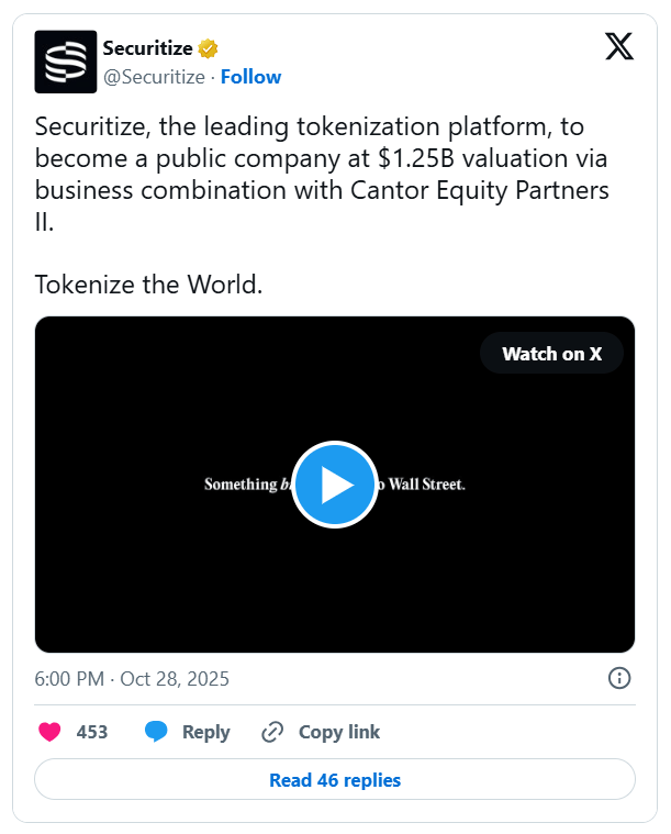 Blockchain tokenization platform Securitize announced plans to go public via a merger with Cantor Equity Partners II. The proposed transaction values Securitize at approximately $1.25 billion and could see its stock trade under the ticker SECZ early next year. The company said it will also issue digital representations of its shares onchain after completion.