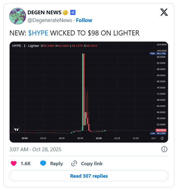 A trading bot triggered an abrupt price spike on Lighter DEX, doubling Hyperliquid’s HYPE token value to $98 Monday. The algorithm rapidly cleared thin order books, creating a brief liquidity vacuum before the market corrected within minutes. Onchain records confirmed the anomaly, though the DEX later removed the extreme wick from its official chart interface.