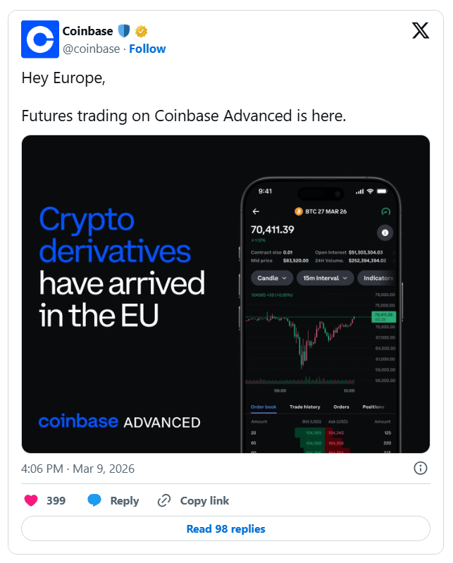 GM. Coinbase launched regulated crypto futures in 26 European nations today, offering Advanced users up to 10x leverage on assets like Bitcoin and Solana via a MiFID-licensed entity.