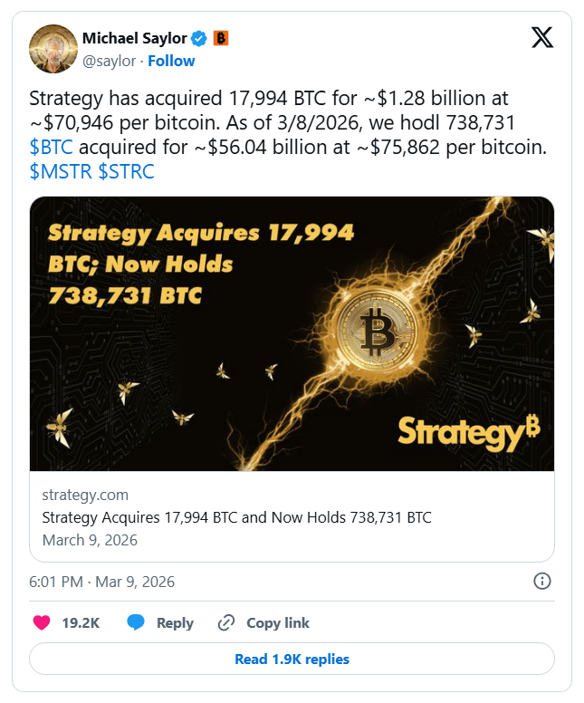 The Virginia-based firm Strategy purchased roughly 17,944 BTC for $1.28 Billion this past week. This massive acquisition represents the company's largest single purchase in over a month and was funded through the issuance of common and preferred shares. Executive Chairman Michael Saylor announced the start of a second century for the firm following its 100th career purchase.