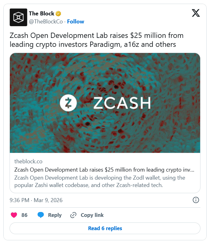 The funding will primarily accelerate the development of Zodl, a mobile wallet that facilitates shielded transactions to hide sensitive user data. Since its launch, the wallet has increased activity in the shielded pool by over 400% while processing $600 Million in swaps. Zcash prices responded positively to the news, climbing over 8% as the team began hiring more engineers.