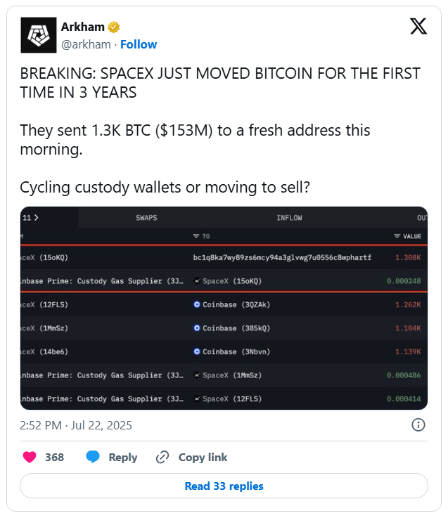On July 22, Elon Musk’s aerospace firm SpaceX transferred 1,308 BTC, worth $150 million, from a long-dormant wallet to a newly created address. Blockchain data from Arkham Intelligence confirmed the transaction, marking SpaceX’s first crypto movement since June 2022. During that earlier period, the company moved over 17,000 BTC to Coinbase across several batches.