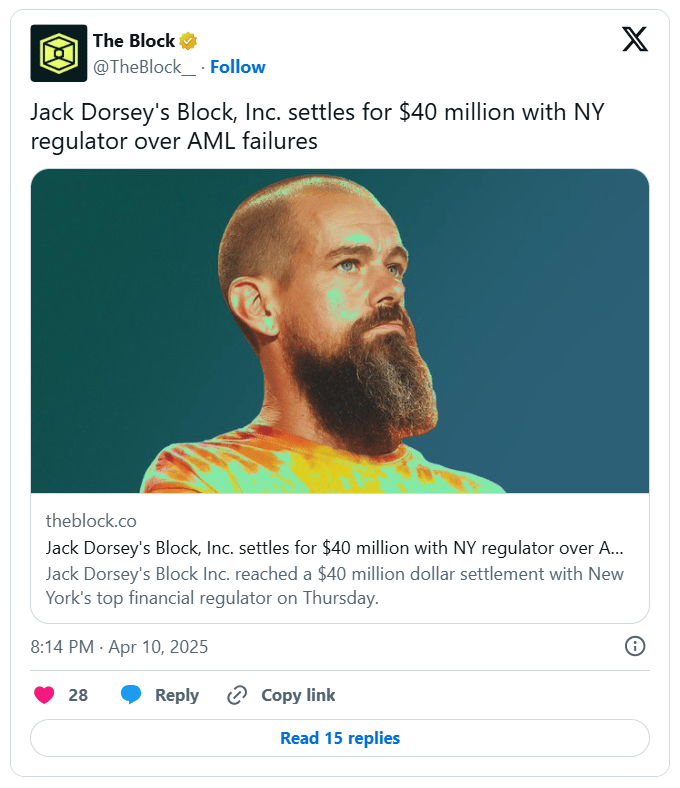 On April 10, Block Inc., the fintech firm founded by Jack Dorsey, agreed to pay $40 million to New York regulators for compliance failures. The state’s Department of Financial Services said Block’s Cash App allowed high-risk Bitcoin transactions without proper monitoring. An outside monitor will now oversee the company’s corrective efforts.