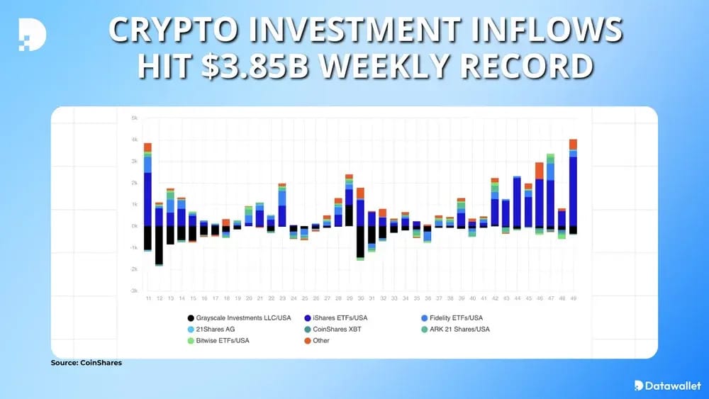 Digital asset investment products recorded their highest-ever weekly inflows of $3.85 billion, bringing year-to-date totals to $41 billion. Bitcoin led with $2.5 billion in inflows, while Ethereum saw a record $1.2 billion, surpassing previous ETF-related peaks. US funds dominated the activity, contributing $2.74 billion.