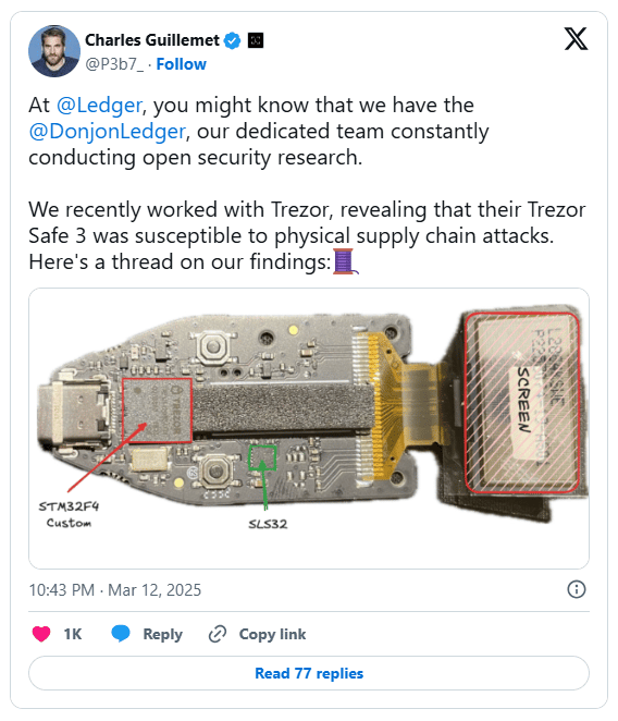 Ledger’s security research team, Donjon, discovered a vulnerability in Trezor’s Safe 3 and Safe 5 models, allowing attackers to bypass security checks. The flaw could have made cryptographic operations on the microcontroller vulnerable, increasing risks of unauthorized access. Ledger CTO Charles Guillemet confirmed that Trezor patched the issue, ensuring user funds remain secure.