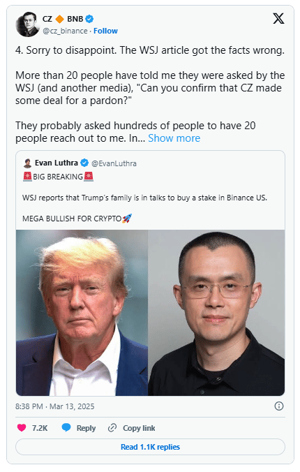 - CZ Denies WSJ Claim on Trump Family Binance Deal & Pardon