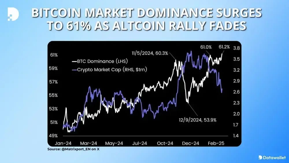 GM. Bitcoin dominance is surging past 61% as altcoin momentum fades, signaling a shift back to BTC as traders brace for macro uncertainty.