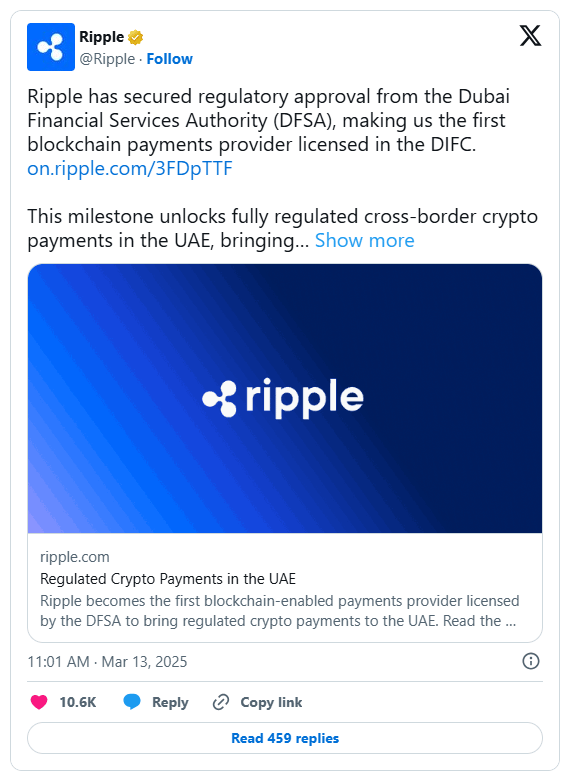 The license enables Ripple to expand its payments network, catering to businesses and financial institutions seeking faster and lower-cost cross-border transactions. DIFC CEO Arif Amiri welcomed Ripple’s expansion, citing the region’s commitment to fintech innovation. With 20% of Ripple’s global customer base already in the Middle East, this regulatory approval is more than welcomed.