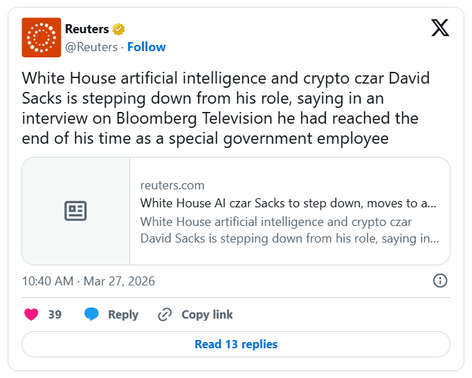 GM. David Sacks exited his role as White House AI and crypto czar today, transitioning to co-chair the President’s Council of Advisors on Science and Technology.