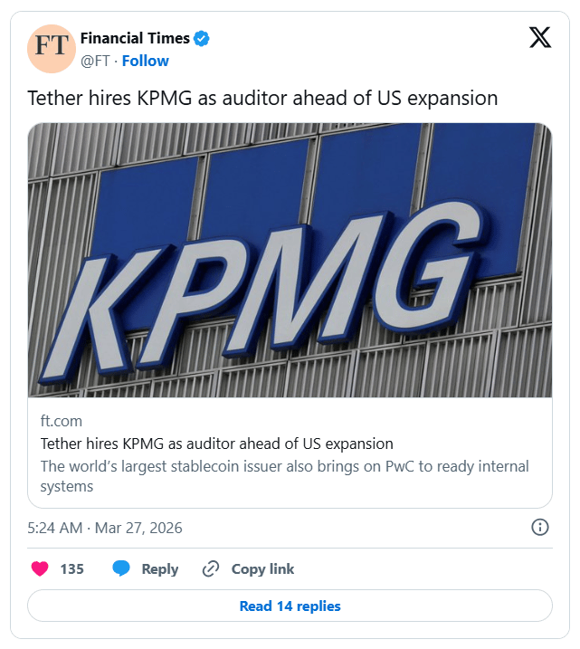 Tether officially appointed the Big Four accounting firm KPMG to conduct a thorough financial audit of its stablecoin reserves. The company also hired PwC to prepare its internal systems for this rigorous examination of its $184 billion in circulating assets. This milestone marks the first time the issuer has moved beyond monthly attestations to seek a full independent audit.