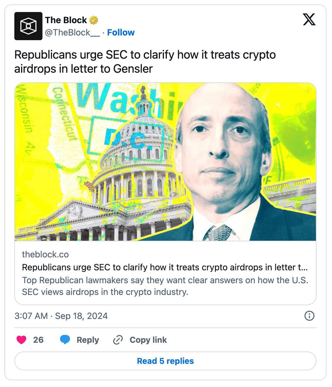 Their letter references the SEC’s case against Tron’s Justin Sun, where airdrops were labeled as securities. The lawmakers also cited concerns about how SEC actions block US citizens from receiving crypto airdrops. They expect Gensler to respond with more detailed guidelines by the end of the month, while another key hearing about the US's stance on crypto will be held on September 24.