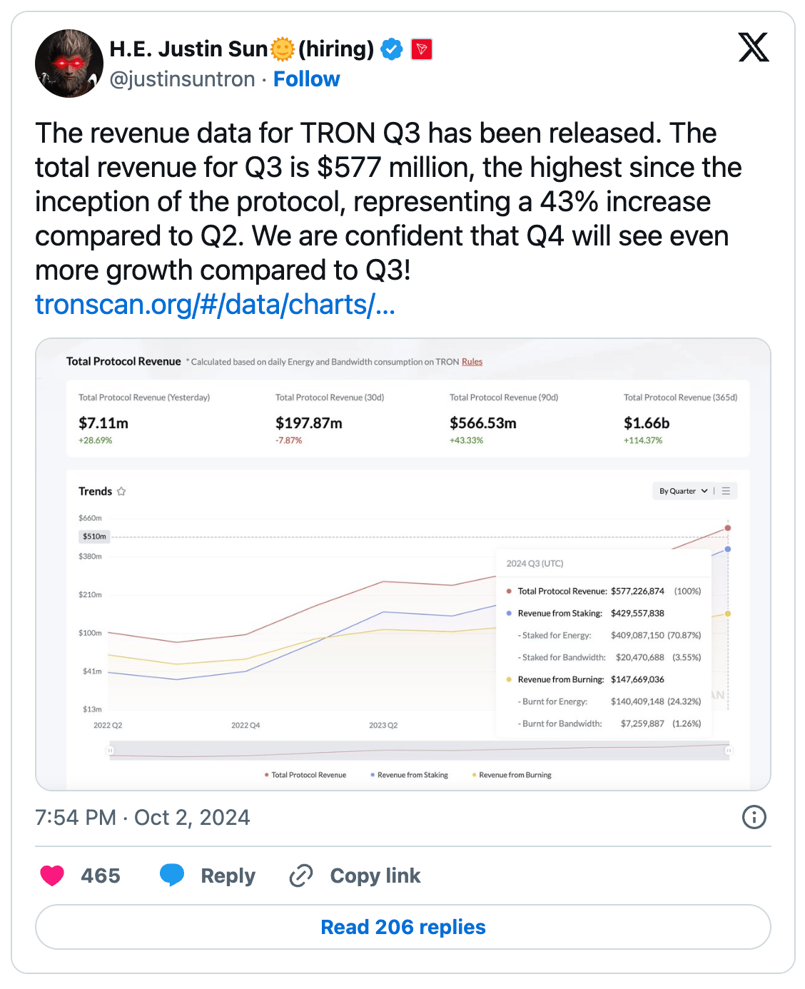 The Tron network achieved record revenue of $577 million in Q3 2024, driven by increased stablecoin activity and a recent push into the meme coin market. According to data from Tronscan, 74% of this revenue came from staking while 26% resulted from token burning. Tron’s performance has outpaced that of Bitcoin and Ethereum in terms of quarterly income, slightly raising its market dominance.