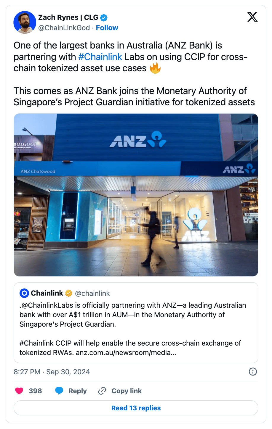 Tokenizing RWAs has been seen as a way to boost liquidity, but one challenge is the lack of interoperability between blockchains. For this, ANZ plans to use Chainlink’s Cross-Chain Interoperability Protocol (CCIP) to address and make transactions smoother. Project Guardian is backed by the Monetary Authority of Singapore and major players like JPMorgan are also showing interest.